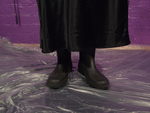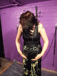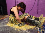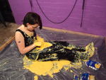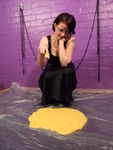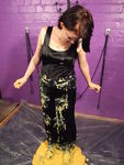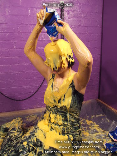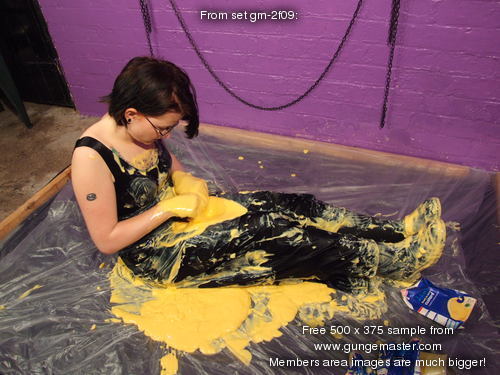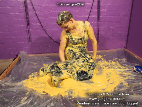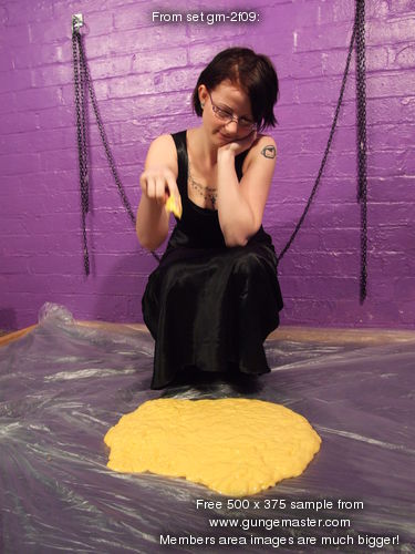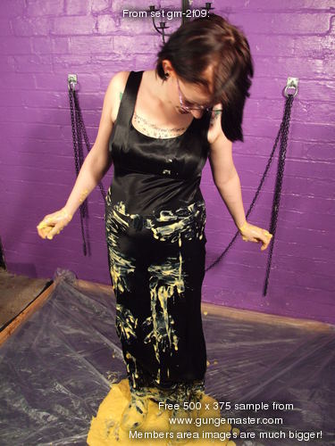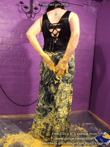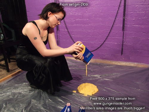 First, she pours four litres of custard onto the floor, making a nice gooey pool, she then slide-steps into the pool, coating the lower hem, and then bends down and ensures the lower few inches of the skirt are thoroughly coated inside and out.