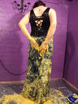 Next she makes custard hand-prints all up the front of the dress, before placing a pair of prints on her silk-clad bottom.