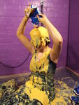 The hand-prints are followed by several litres of custard down the front, then she sits in the floor pool and plays with the custard and her dress, also taking time to carefully fill each wellie with yellow goo.