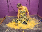 Finally, she covers her hair, shoulders, and still-clean back in yellow mess. Satisfied that the dress is indeed suitable for wearing in a barrel of beer, she sits back and relaxes in the custard.