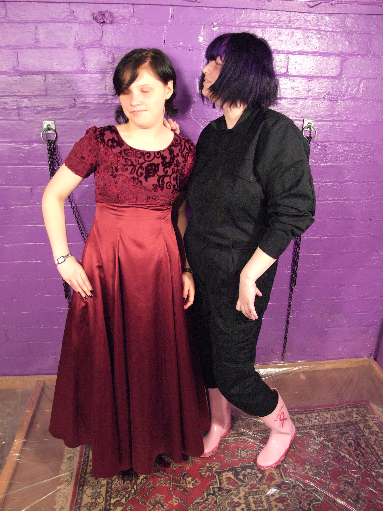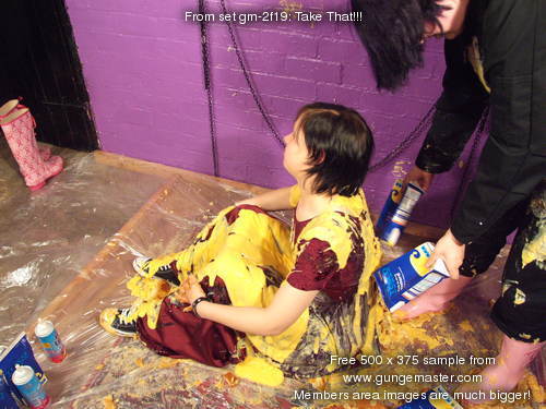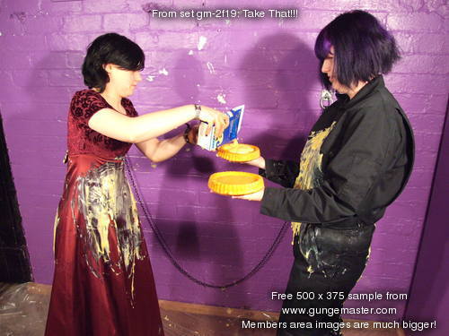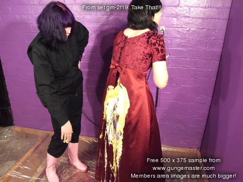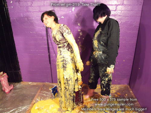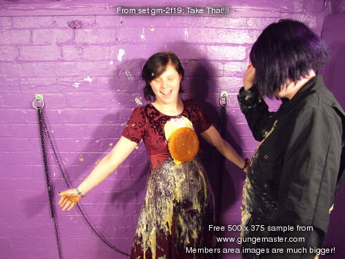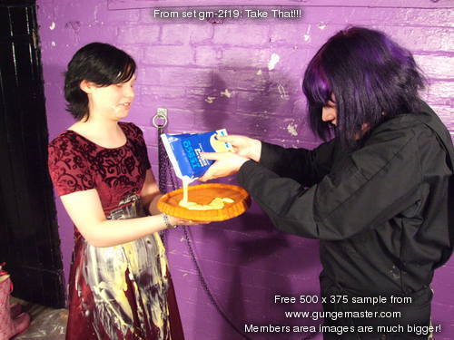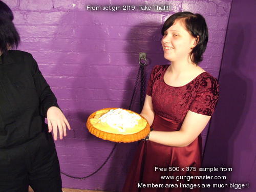 Nurse Wendy and Lady Full Wellington spend a relaxed afternoon in Lady Jasmine's dungeon exchanging custard pies with each other. At least it was supposed to be relaxed until Nurse Wendy managed to land a pie on Lady F-W's bottom with sufficient force that pie-filling splattered everywhere, including the ceiling!