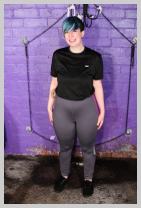 Virginia wears grey women's running trousers with pink flashes and a thin black loose sports top, no socks, and black plimsolls. Daisy is wearing a black one-piece swimsuit with pink detailing, and black shiny wellies.