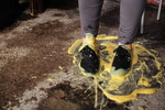 Next comes custard and cream poured into Virginia's trousers, she holds them out herself while Daisy pours the mess in down the front, and in the photos you can clearly see Virginia reacting as the cold wetness slides down inside and flows down her legs, while the video has a close-up of her trunk and legs and you can clearly see the material bending and moving as the custard pours in and flows down inside. Once plenty has been poured in the front, Virginia turns round and has more poured in the back. Somewhat to everyone's surprise, none of the gunge seeps through, although we can clearly see the fabric moving as the mess flows down inside, they do a remarkably good job of keeping it all inside. Clearly that will never do so next Daisy prepares a tray of custard and syrup, and then has Virginia sit in it. That's better, now she's becoming a proper mess!