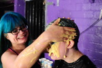 Our blue-haired artist Daisy invited her blue-haired friend Virginia to the Hall, so she could experience the joys of having her favourite running gear filled with mess while she is wearing it. Virginia had never been gunged before so you get to see her reactions as the mess flows in.
