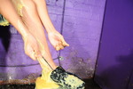 She also fills her sports shoes, and then slips her clean bare feet back into them, and then once her suit is thoroughly flled with custard she pours more all over herself, including a total messy shampoo and facial. She ends up completely covered from head to toe in custard.