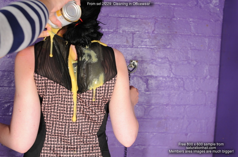 Following on from helping Maria with her very sexy boilersuit demonstration, which is now available in the Imperatrix Domina download store, Honeysuckle, still in her perfectly clean and dry smart office dress with tights and heeled leather shoes, was left to clean up the mess she'd helped to make.