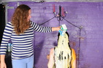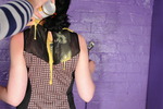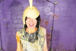 Honeysuckle is made to sit in a tray of mess, then her shoes get the treatment, one drenched in soup, the other in custard, various messes are poured down inside the front of Honeysuckle's dress, where we can see them flow under the mesh upper part and then soak through the main part of the dress from inside, she has soup and cream thrown over herself, and she gets a total messy shampoo and face pour too. Through all of this Maria, dressed casually in jeans and a stripey top, remains completely clean and dry.