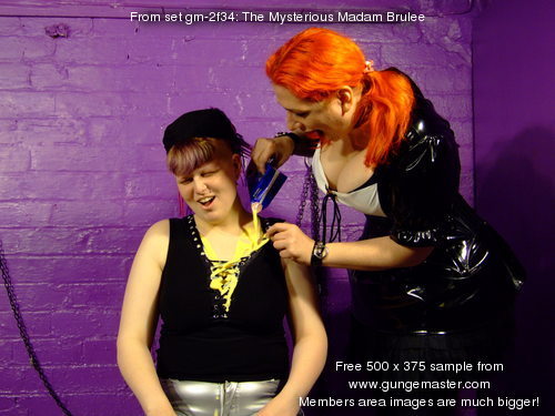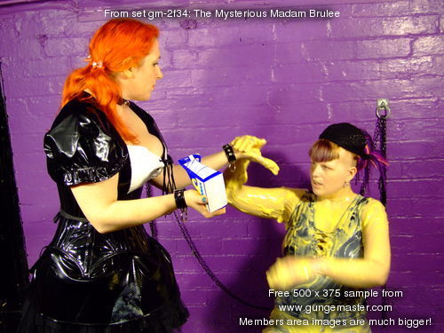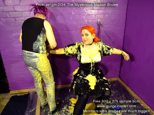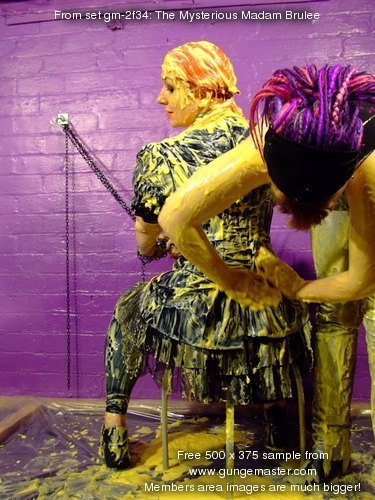 Watch and enjoy as cleavages are filled, Madam Brulee's PVC dress is totally coated in custard, and Lady Full-Wellington has her PVC jeans completely filled, with lashings of custard poured in, front and back.