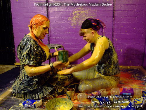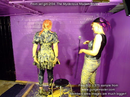 Of course no visit to Saturation Hall is complete without a thorough gunging in the dungeon, so Lady Full-Wellington leads Madam Brulee down the spiral stairway, and then submits to the French noble's tender mercies with the custard, before siezing the chance to turn the tables and give the visitor a proper Saturation Hall custardisation!