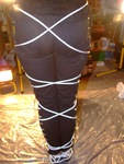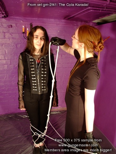 First, comes the rope. Rose stands the willing victim while Ms Graves gradually binds her ever more completely into a full-body karada, the interlacing ropes steadily rising as Rose becomes completely imobilised.
