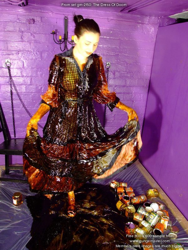 The dress is given a total treatment, filled, and then lavishly coated in mess. The shoes don't escape either, not only do they get covered in goo running off the drenched dress, they also get neatly slipped off, carefully filled with gunge (treacle in one, syrup in the other), and carefully put back onto Veronica's bare feet.