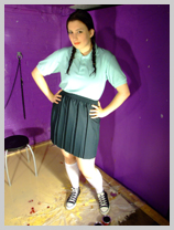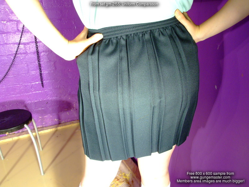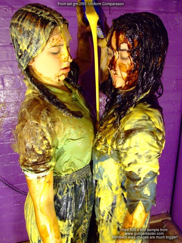 Fair is fair, so Rose now submits to Veronica, and is given a nice messy gateaux, topped off with syrup, to sit in herself. So much for her smart blue uniform skirt - squelch! - and she also has a nice sticky bum. Rose remains seated while Veronica pours more syrup all over the front of Rose's skirt till it pours off the hem and all over her black plimsoles.
