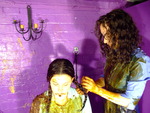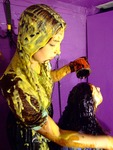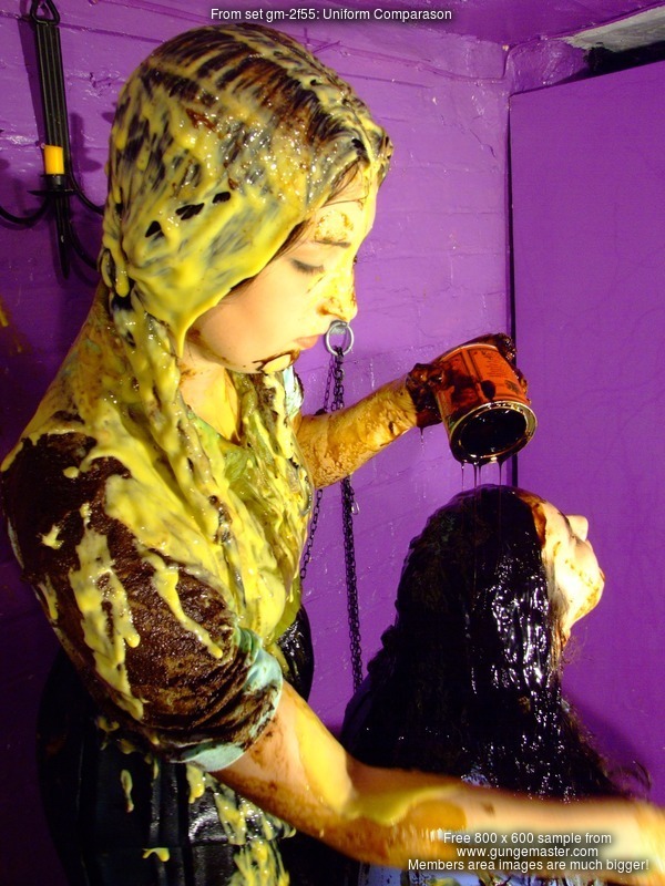 Now the girls have thoroughly tested each other's uniforms, but that's not quite enough - so they give each other very messy shampoos too! Veronica goes first, and then once her hair's been thoroughly drenched in mess it's Rose's turn, her long curly hair completely drenched in custard and treacle.