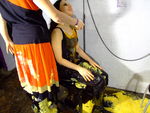 Both girls end up with their outfits thoroughly drenched in gunge, and then take a long hosedown together, during which Miss Pink stips down to just her swimsuit and boots!
