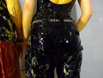 Trays of gunge are sat in, much pouring is done, mainly golden syrup on Felicity's black outfit, and custard on Miss Pink's stylish bold patterned 80s gear.