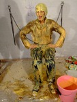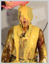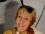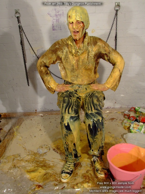 Sticky cakes to the head come next, a cake sandwich and pies, and then a black treacle shampoo! And then lots and lots of gunge pouring, more jumper filling, and once her front is well covered, she's made to lie face-down on the messy floor while her still-clean back is given the full treatment too. We don't leave anyone half-gunged at the Hall!
