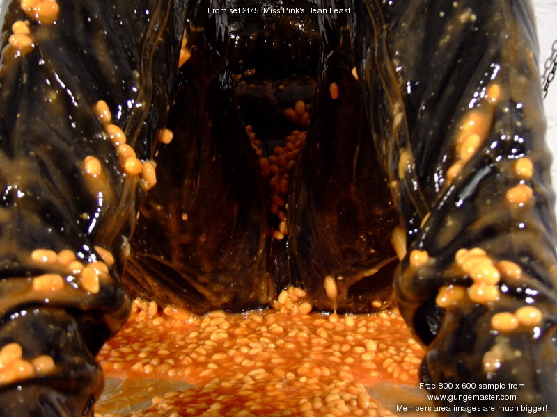 Once her entire costume has been coated, Miss Pink sits up in the pool of beans on the table for the piece de resistance, when Modesty empties an entire bucket of baked beans over our gunge girl's head!