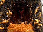 Once the eggs are dispatched, it's time to bring out the beans, and that lovely shiny black costume is slowly but steadily engulfed in mess as can after can of beans is carefully poured over our beautifully willing gunge victim.