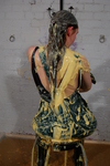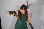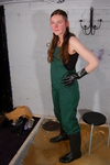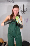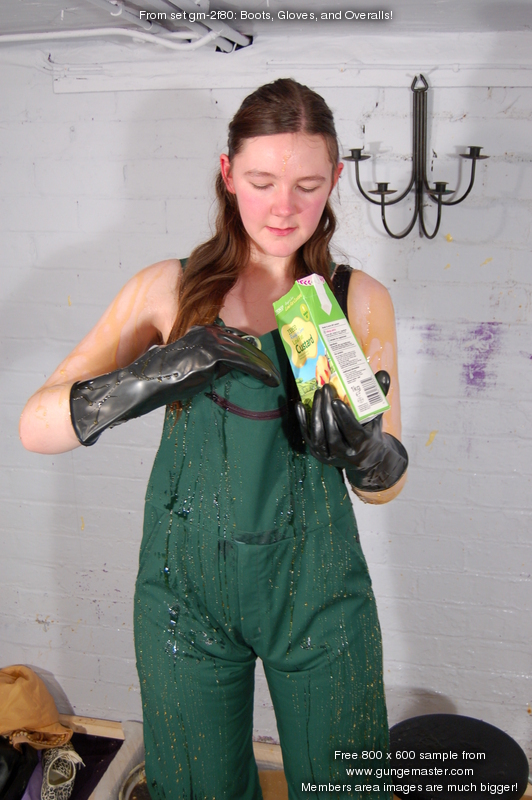 Here's Chastity, in black boots, green overalls, and big black rubber gloves, just having some fun in the dungeon, and gradually getting totally gunged in the process!