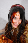Highlights of the scene include Rose sitting down in the pool of gunge on the dungeon floor, clothes filling of her smock front and back, detailed pocked filling, very careful gunging of her smock and leggings including lots of her rubbing the gunge in, and then finally, as the piece-de-resistance, she very carefully and thoroughly gunges her lovely hair with lots and lots of thick black treacle!