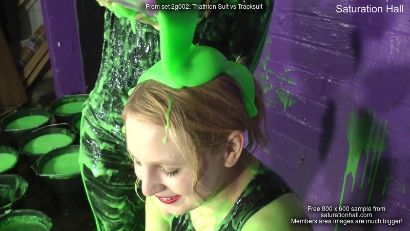 There's gunge-sitting, suit filling, pockets filling, slathering bright gunge all over each other, and of course full head and hair gunge shampooing too. By the end of the scene our two exercise girls are reduced to green gloopy messy misses, drendhed from head to to in gunge.