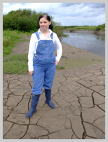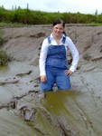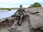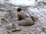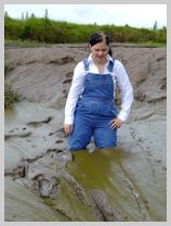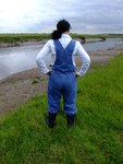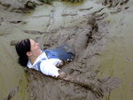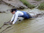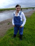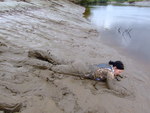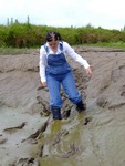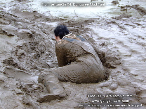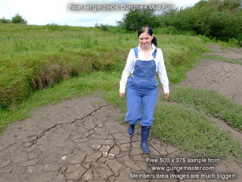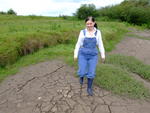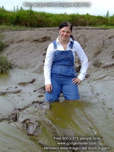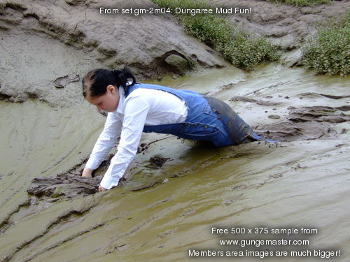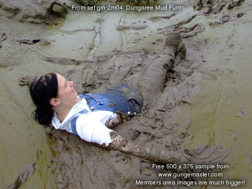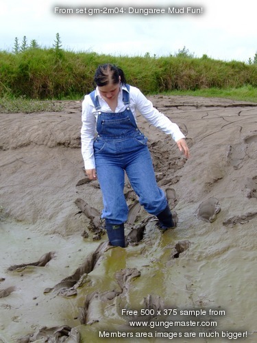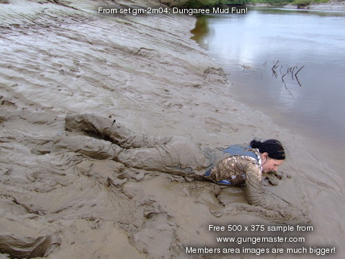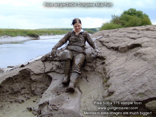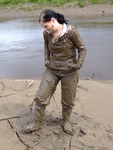 Wendy spends a pleasant morning in the soft clay of an east coast riverbank, wading in, sinking to above her knees, sitting down, crawling through, and sliding about in the beautifully rich, sloppy, soft clay. She gets her boots, dungarees, and shirt completely coated in mud, and has fun sliding down the banks and rolling about in the soft mud. What a wonderful way to wake up!