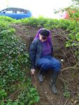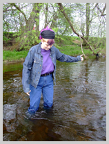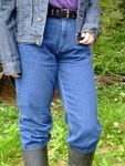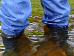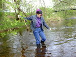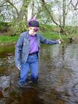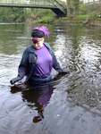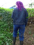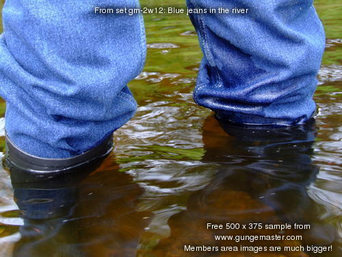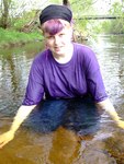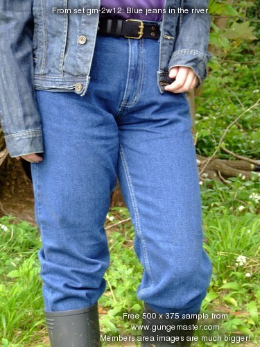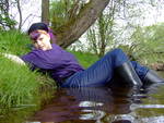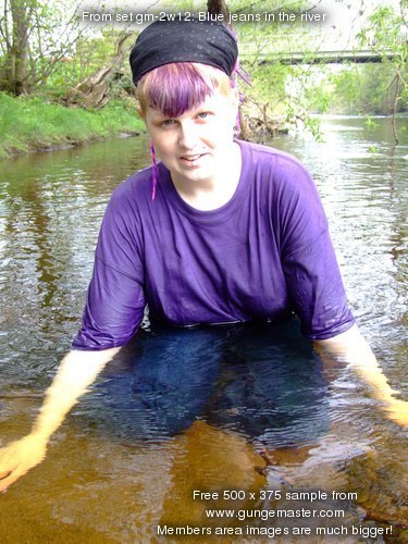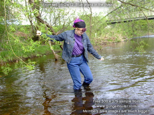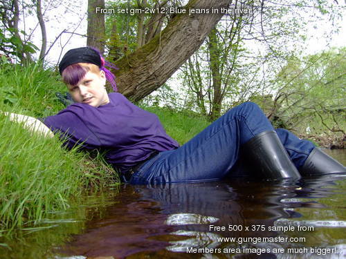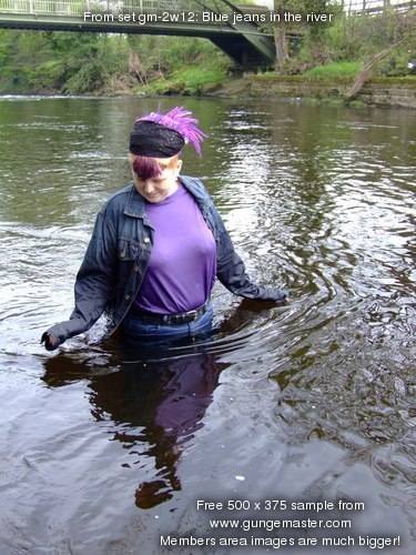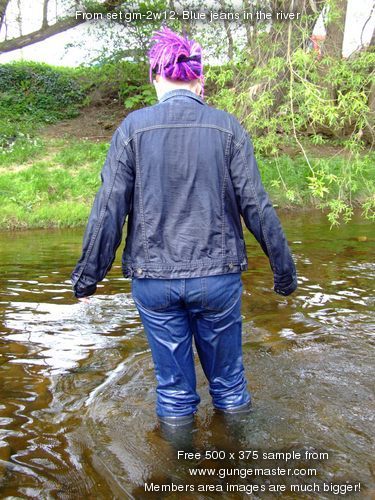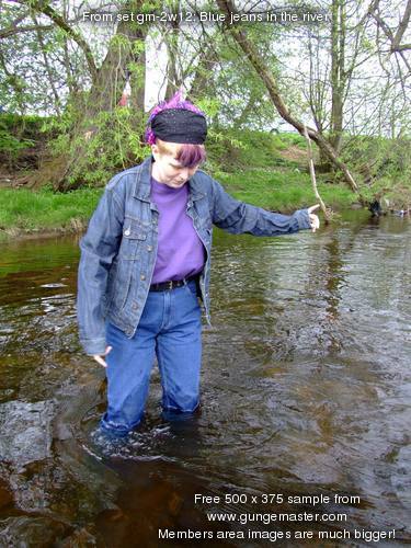A balmy late spring day sees Lady Full-Wellington taking a refreshing dip in the river, casually dressed in blue jeans, purple t-shirt, blue denim jeans jacket, and blue rubber boots. After sliding down the bank on her bottom, she wades slowly into the water, until her boots are flooded and filled, then gradually goes deeper and deeper until she's swimming in the current. Then she walks back towards the bank, soaking wet, and sits down in the shallow water for a rest and some nice poses. Eventually she takes her jacket off, poses some more, then walks out of the river, takes her boots off and empties them over herself, and finally climbs back up the bank in her socks, still dripping wet.