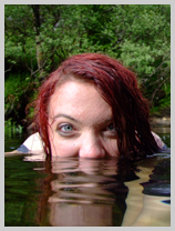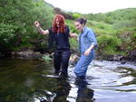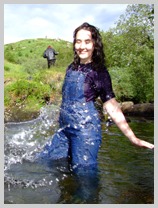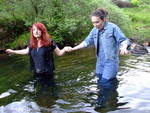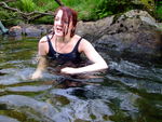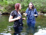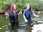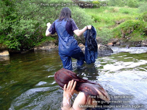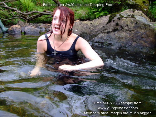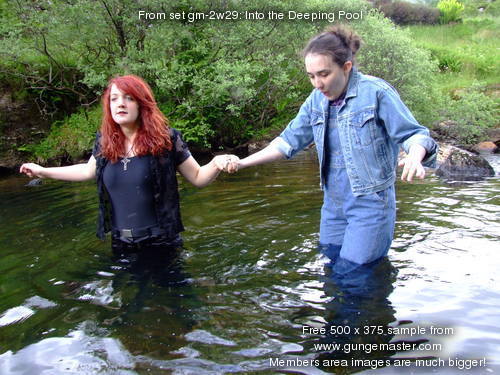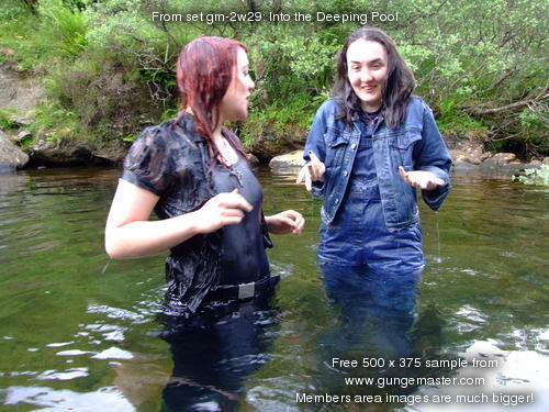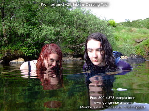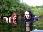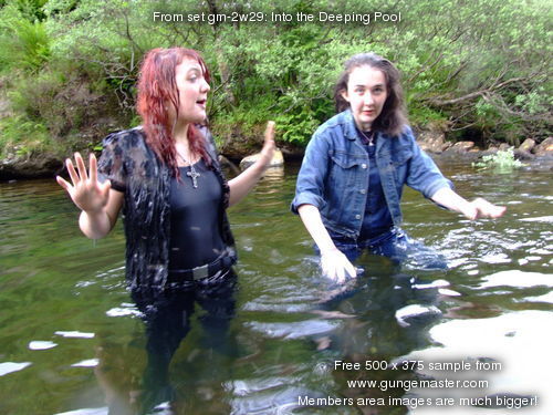 Morgana takes off her shirt, and Rose removes her jacket, and they swim about a bit, playing like seals in the clear Highland stream. They pose, soaking wet, on a rock together, and then again, still in their drenched clothes, by the pool.