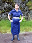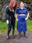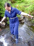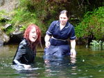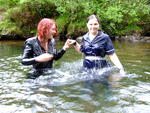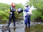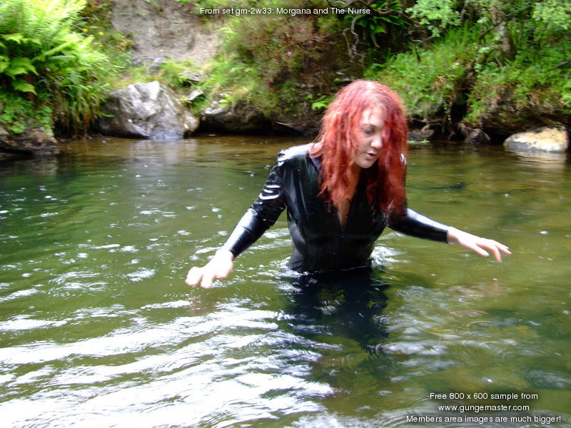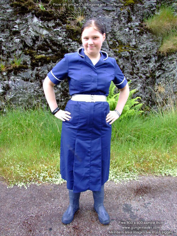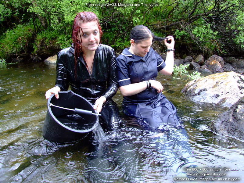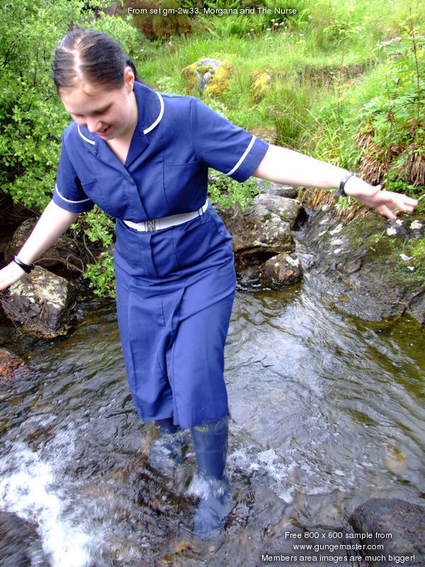 The two walk down to the Deeping Pool together, and stand in the shallows, the water just lapping at their rubber boots, where Wendy willingly stands and poses while Morgana throws several full buckets of water over her, front and back, mostly drenching her smart nurses uniform dress.
