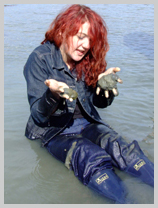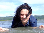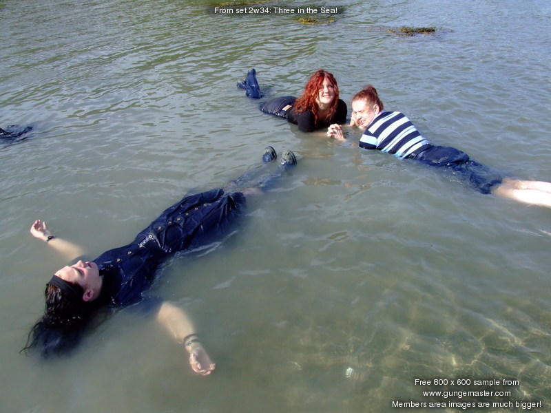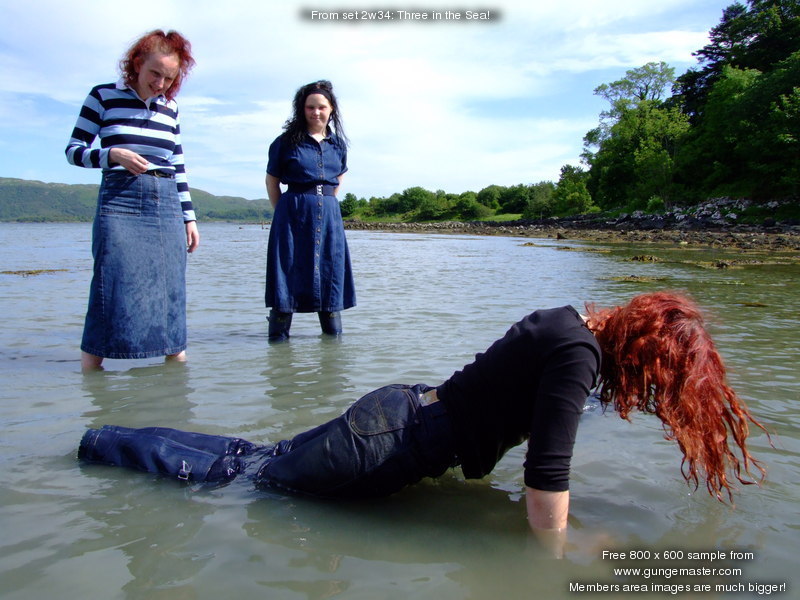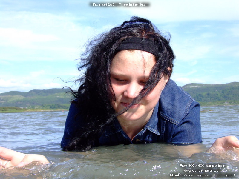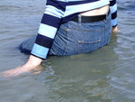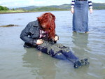 Morgana goes first, carefully and slowly lowering her shapely denim-clad bottom into the water, soaking her jeans and stretching out on the muddy and sandy bottom of the bay. Rolling over, she covers the front of her jeans in sandy mud, then removes her denim jacket and does some press-ups in the water, soaking her t-shirt.