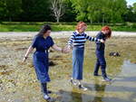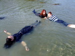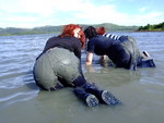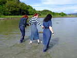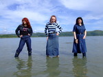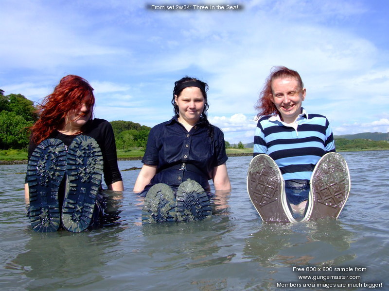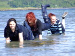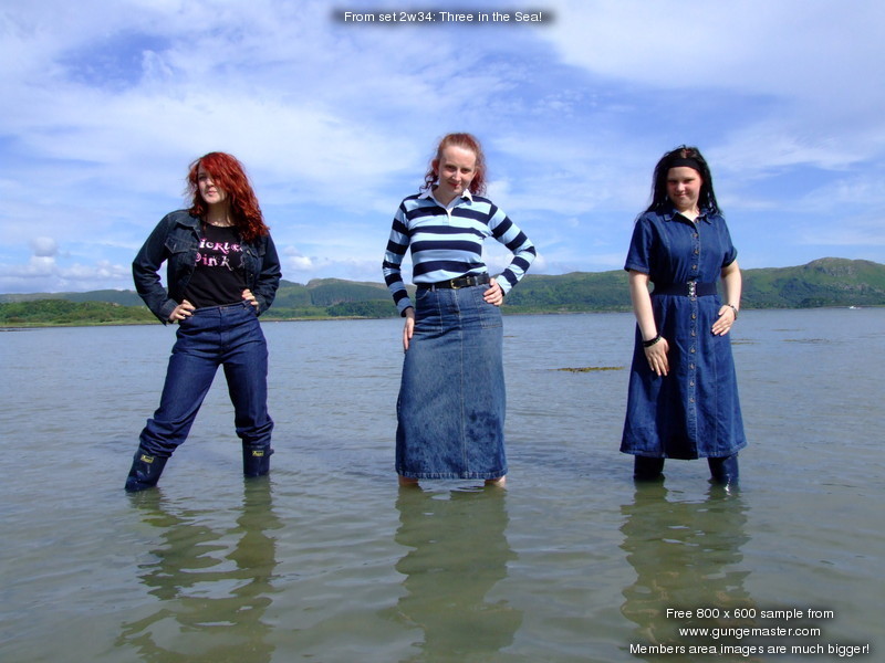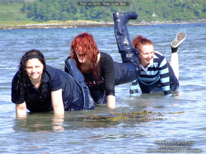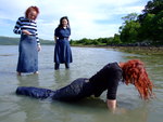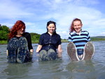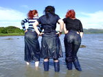 Not that she offers much resistance! The three ladies wade out for a good way into this very shallow bay, the water never quite getting deep enough to flood their wellies, and once they've found a nice spot, they take turns to carefully drench their outfits, one by one.