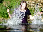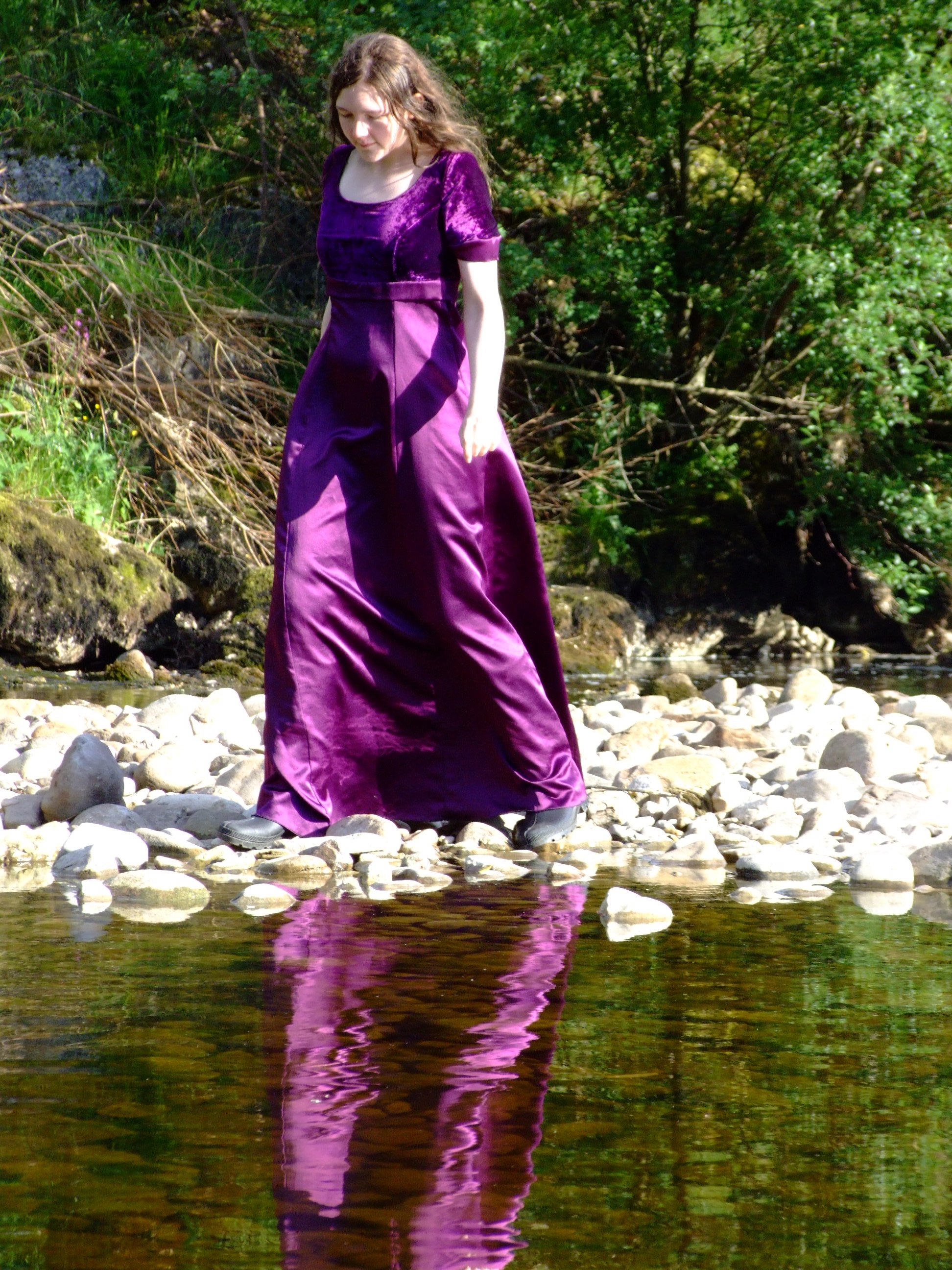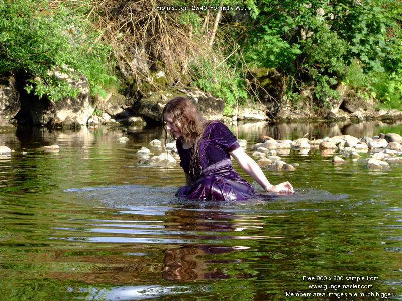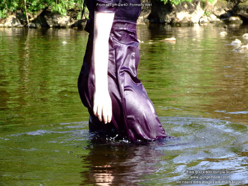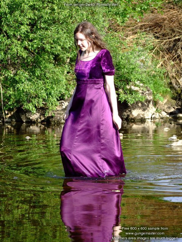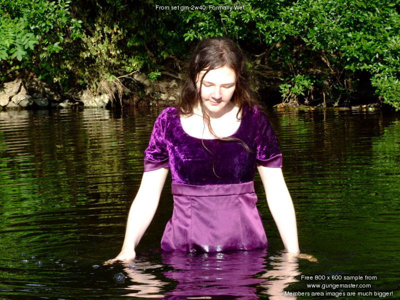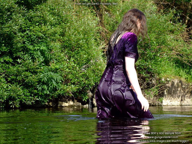 Dressed in a beautiful purple satin formal dress, Chastity wades into the Langstonedale waters and soaks herself completely.