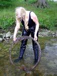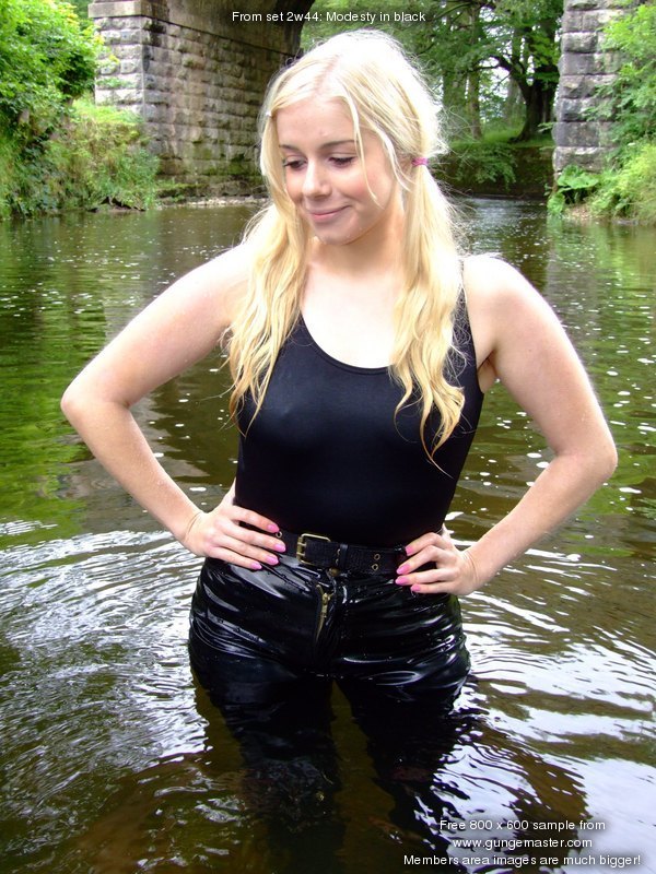 For now though, Modesty gets to test out her own favoured explorers outfit in the water, knee-high lace-up boots, slinky shiny PVC jeans, and a black swimsuit as a top.