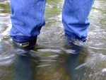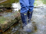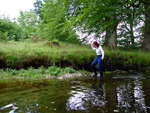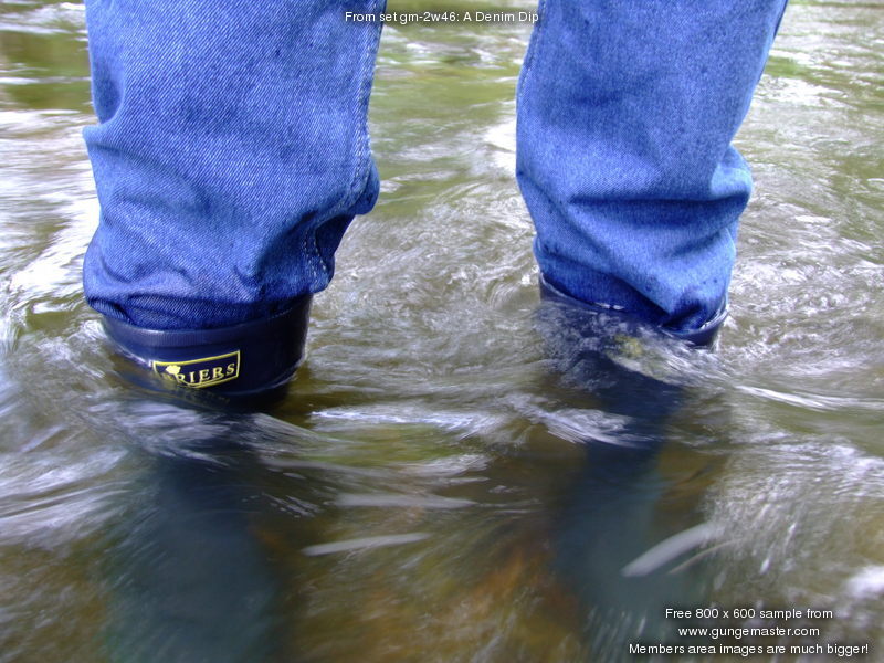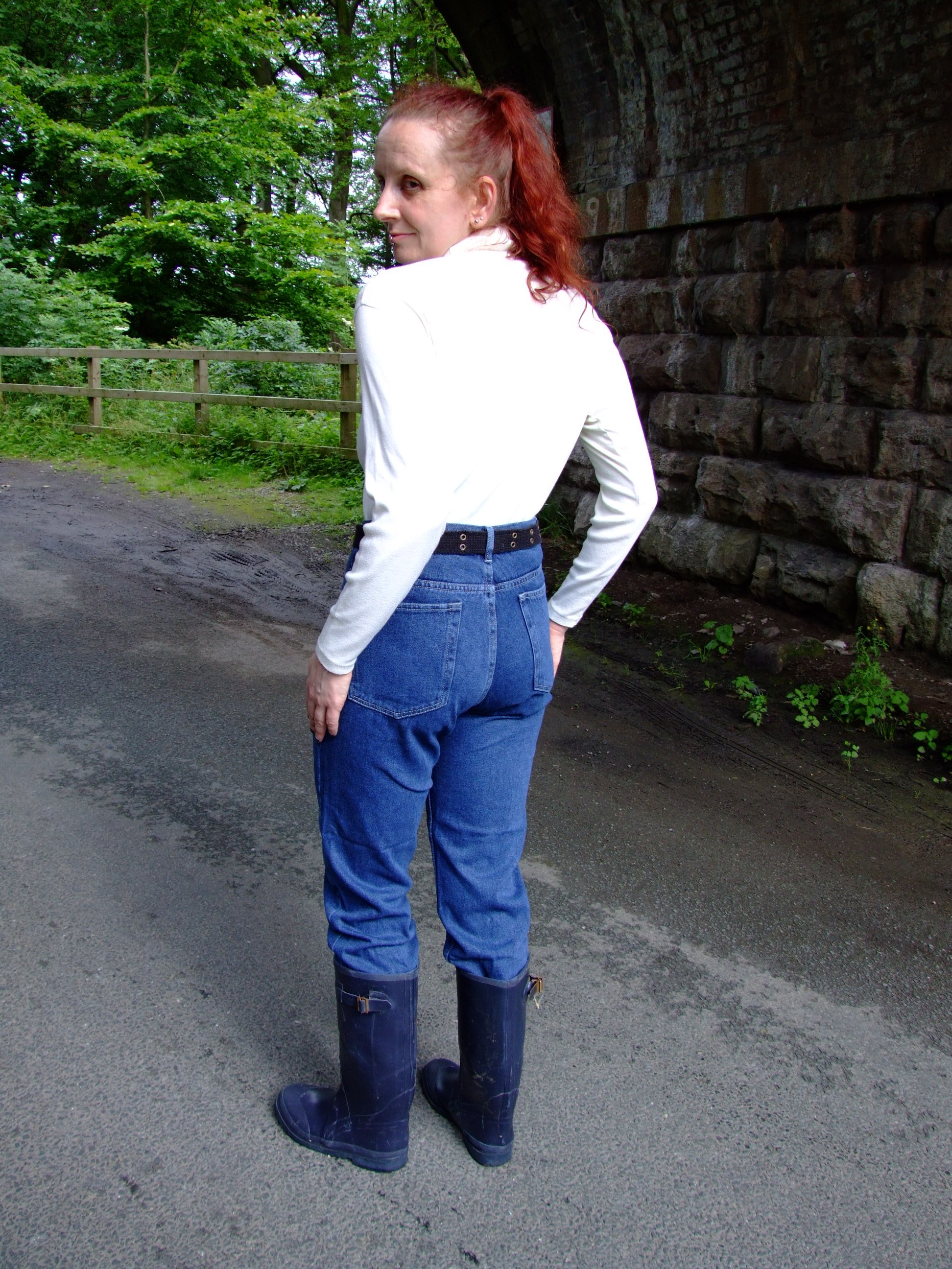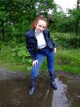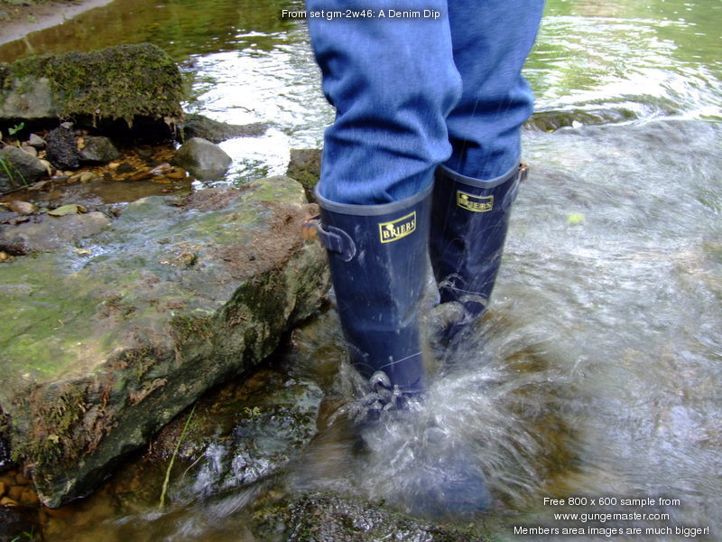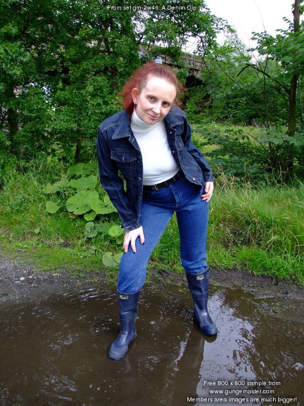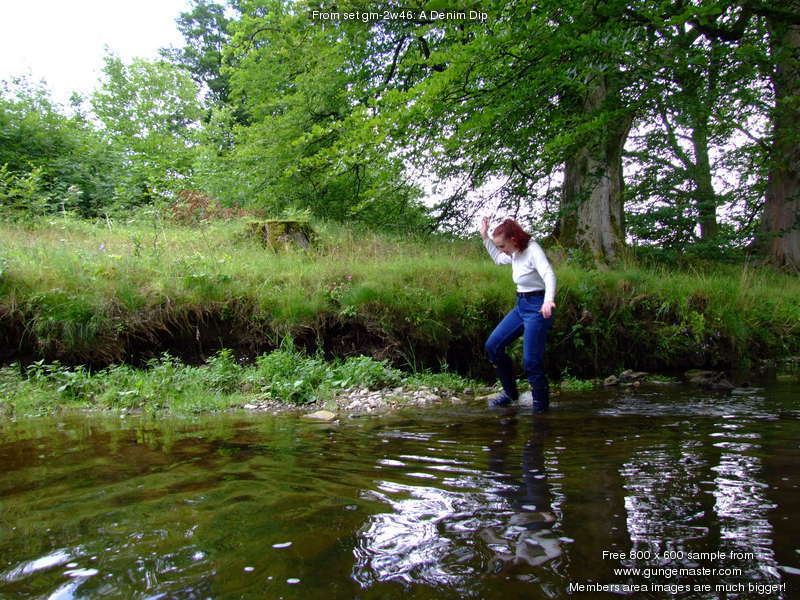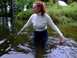 Dressed for the country in rubber boots, blue jeans, white jumper and blue denim jacket, Lady Amaranth goes for a paddle in the river below the viaduct.