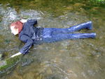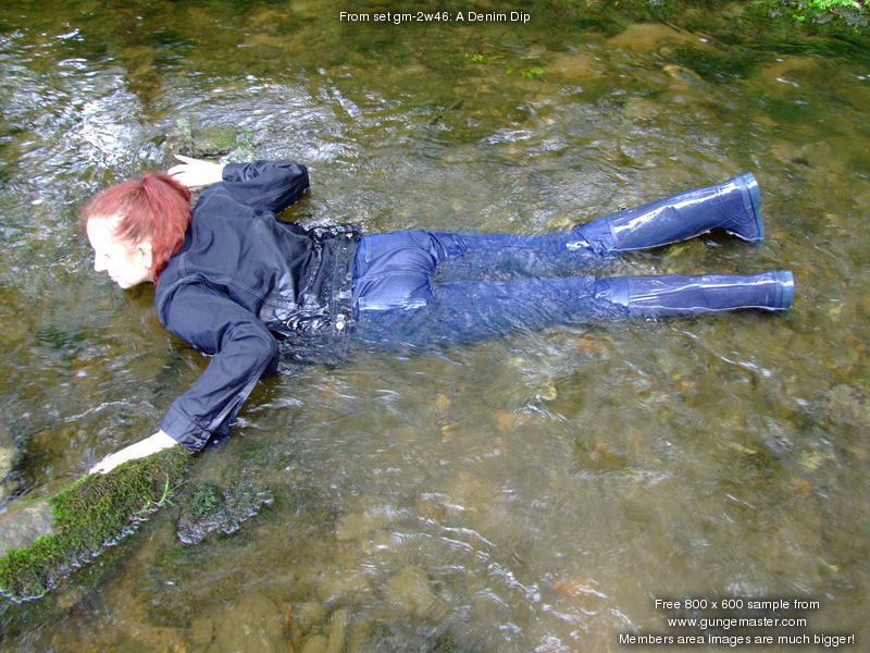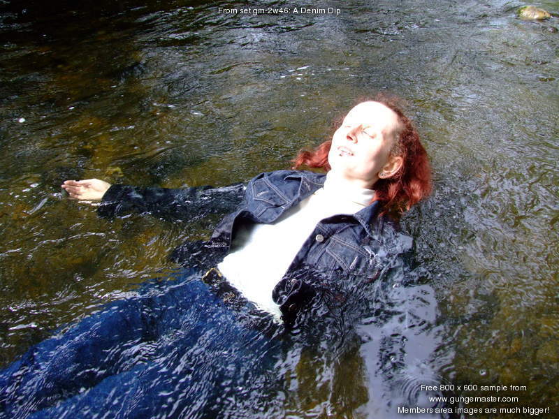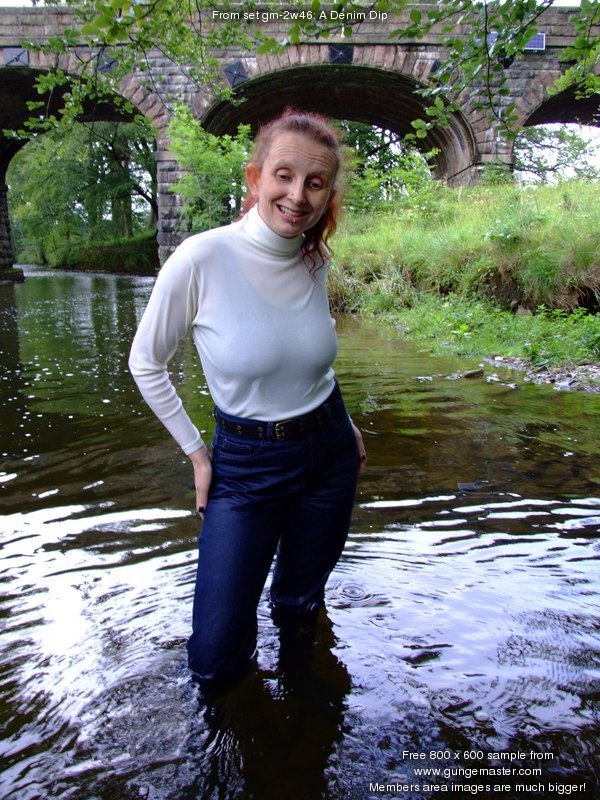 She takes the jacket off for the first part of the paddle, and without it she slowly wades upstream and down into the deeper water near the beautiful stone arches. First she floods her boots, then wades gradually deeper, drowning her jeans, and then dips herself shoulder-deep in the water. She plays in the river, showing off her soaked clothes, before returning to where she left her jacket, putting it on over her soaked jumper, and drenching it, and the rest of her outfit for a second time, lying down in the flowing water. Finally she poses, soaking wet, on a fence by the roadside above the water.