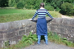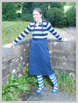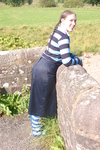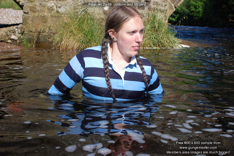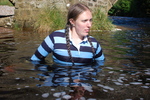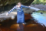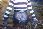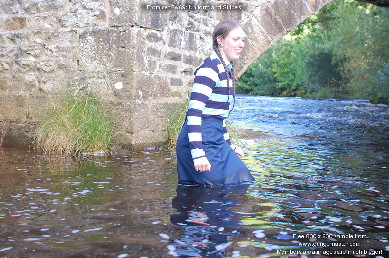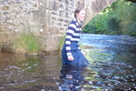Which is how she comes to be wading into the river, at the stone bridge just above the village, dressed strikingly in a blue and white striped rugby shirt, blue and white striped wellies, and a navy blue knee length uniform skirt. All of which get thoroughly soaked as she dips herself in the peat-coloured river water.