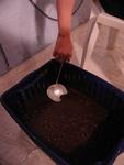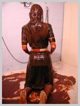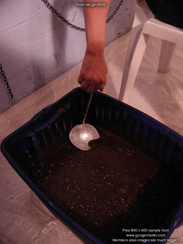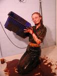 Jasmine starts sitting in her white plastic chair, dressed in her smart uniform, with a ladle and a nice big tub of fresh gravy beside her. Starting with her lap, she scoops up ladle after ladle of gunge and pours them onto her costume, first filling her lap till the goo runs over her knees and pours onto her shoes, then standing up, creating a pool of gravy on the seat, and sitting in it, before moving on to pour more gravy both over and inside the top of her dress. Later on she shampoos her hair in the tub of gravy, before picking the whole tub up and pouring the remaining liquid all over herself. She ends up totally and utterly drenched in gravy, inside and out.
